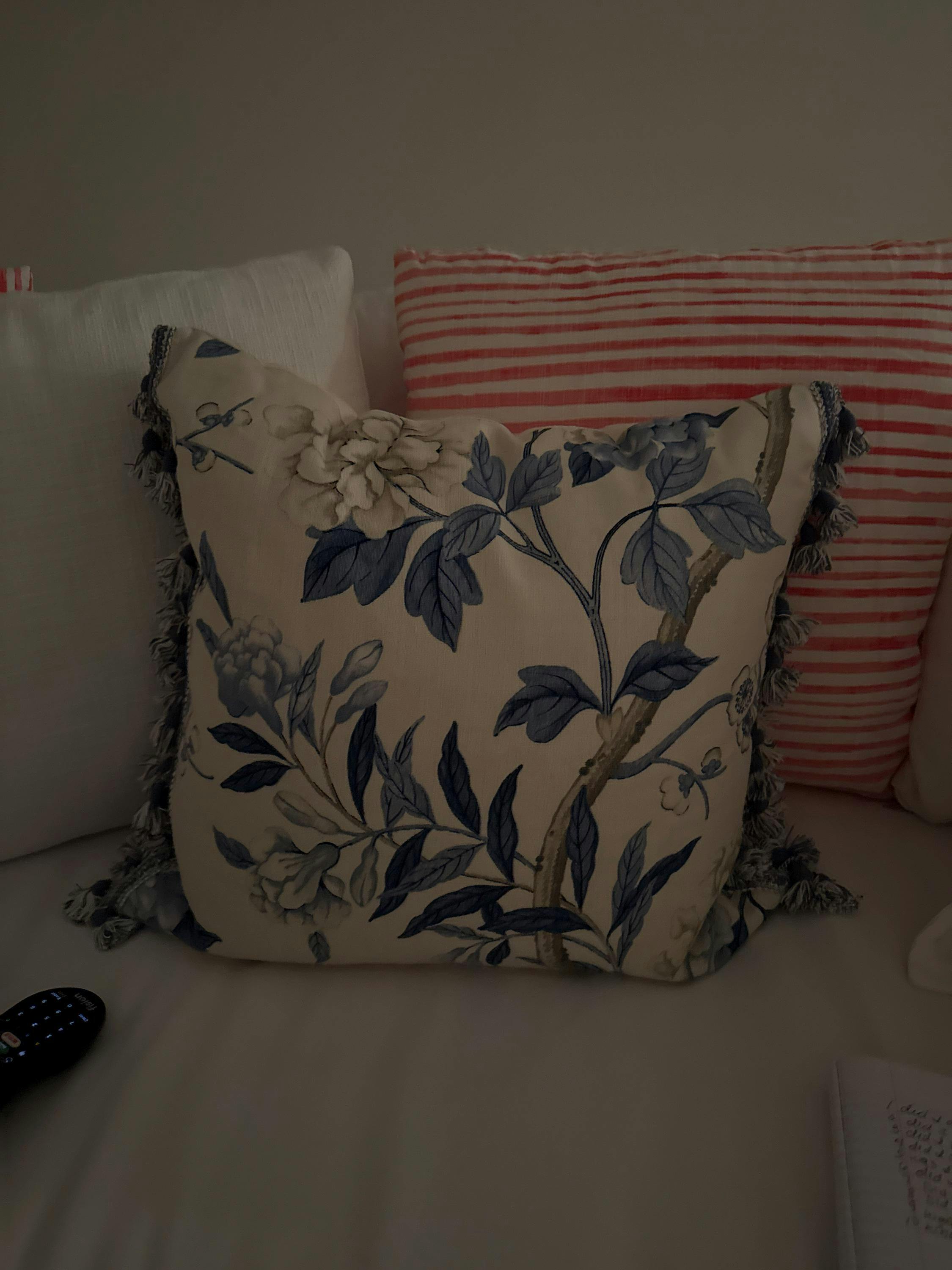 Artful and serene, the Emperor’s Garden Pillow in Porcelain Blue brings timeless botanical elegance into your home with its flowing chinoiserie pattern, refined linen texture, and graceful tassel trim—a statement of quiet luxury.