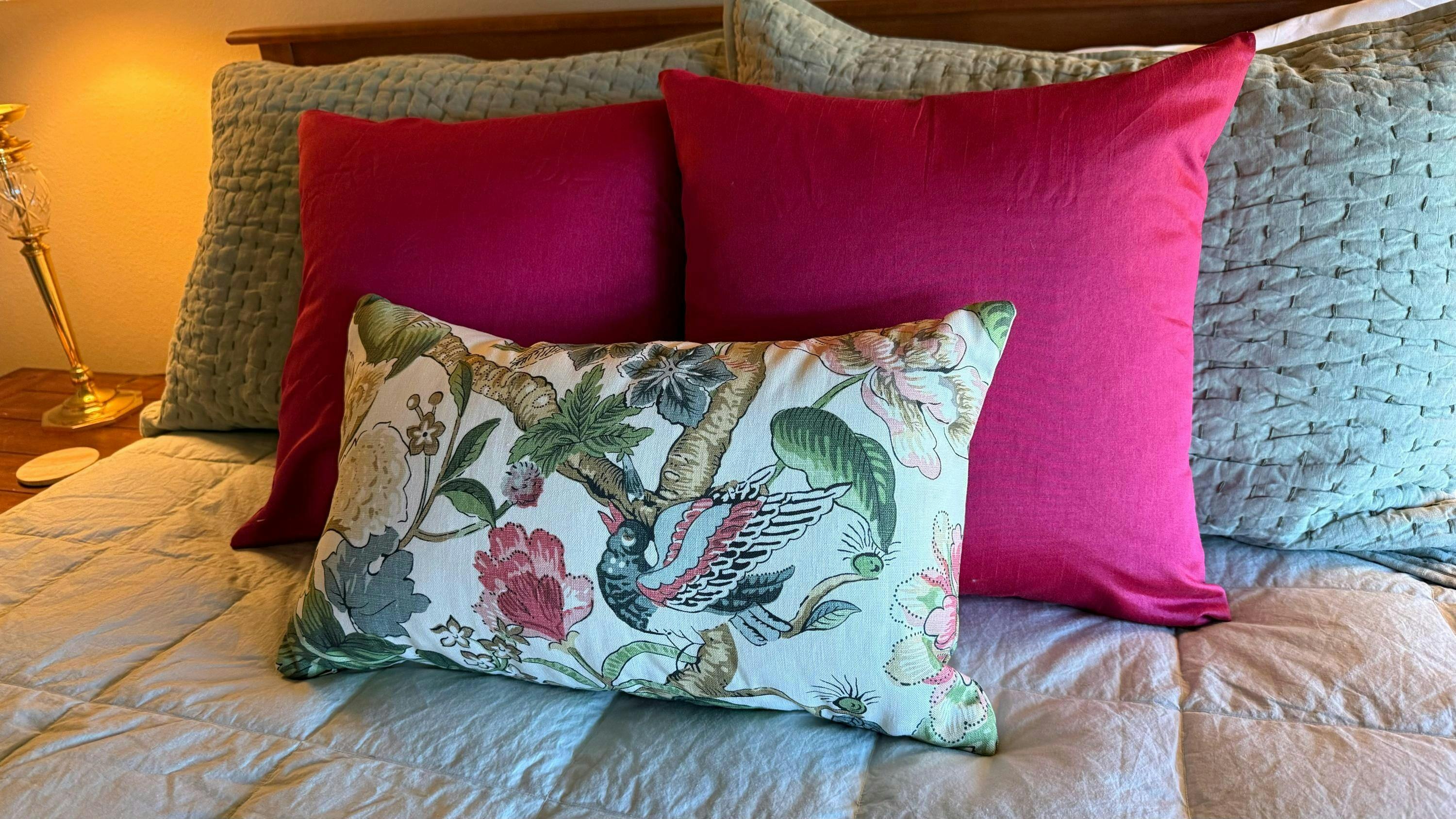 Thibaut Hill Garden Linen Pillow in Green and Coral.
