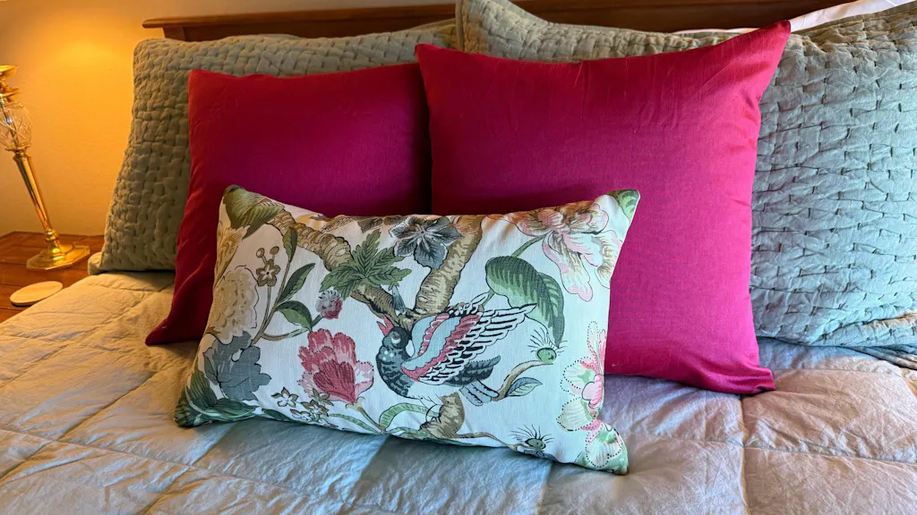 Thibaut Hill Garden Linen Pillow in Green and Coral.