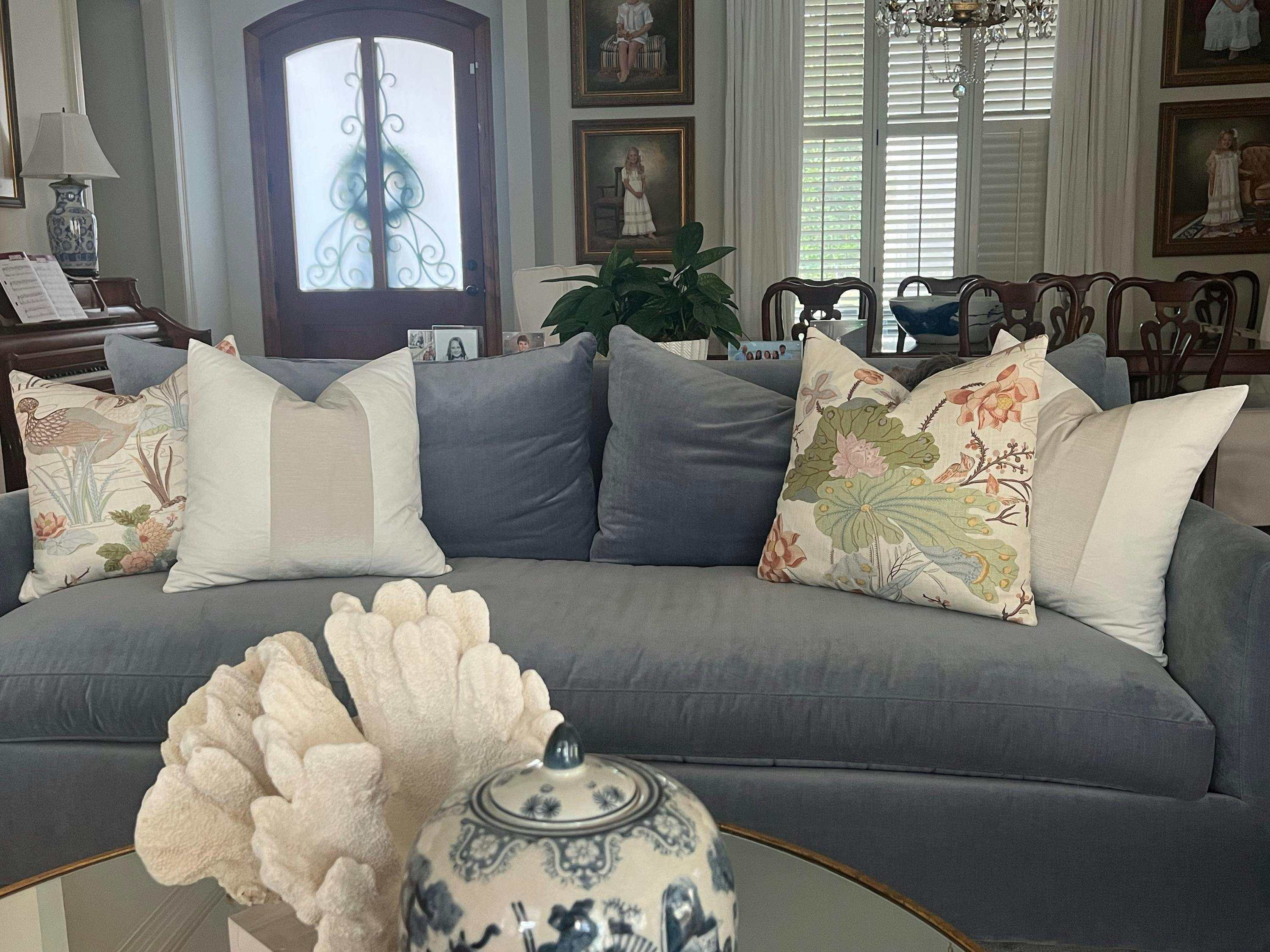 Warm and painterly, the Luzon Pillow in Apricot blends soft cream tones with layered florals in apricot, blue, and green. It’s a nature-inspired statement piece that adds instant charm and graceful movement to any space.