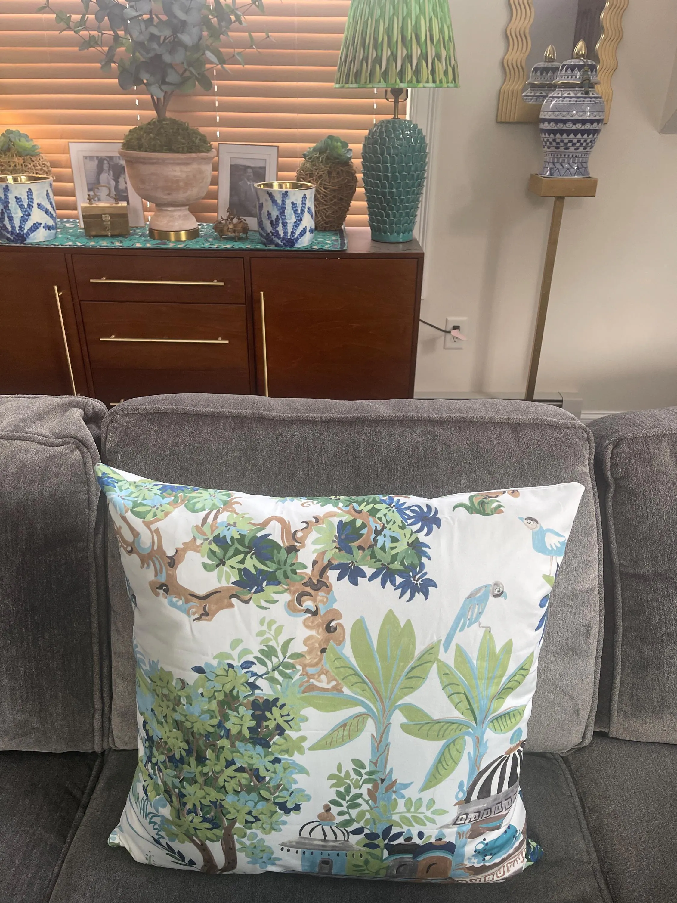Thibaut Mystic Garden Pillow in Shades of Green and Aqua Blue on Off White Background. This Gorgeous Decorative Pillow will make a statement in your beautiful home. Pillow Cover is 100% handmade, designed, and created with attention to details.