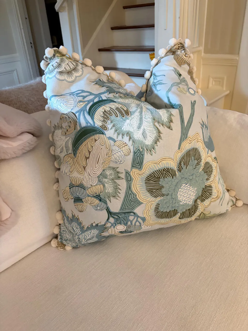 Timeless elegance meets playful charm — the Thibaut Indienne Jacobean Pillow in Seaglass and Gold brings 19th-century French-inspired florals to life, finished with cream pom pom trim for a designer look that’s both sophisticated and unique